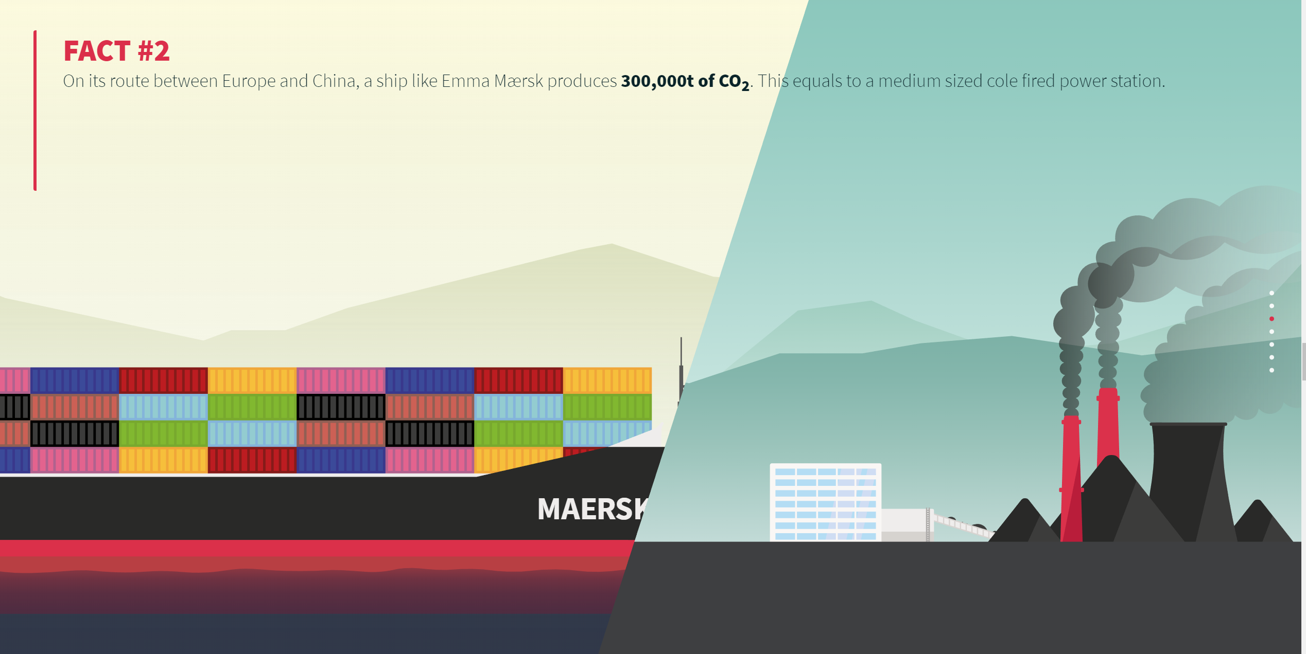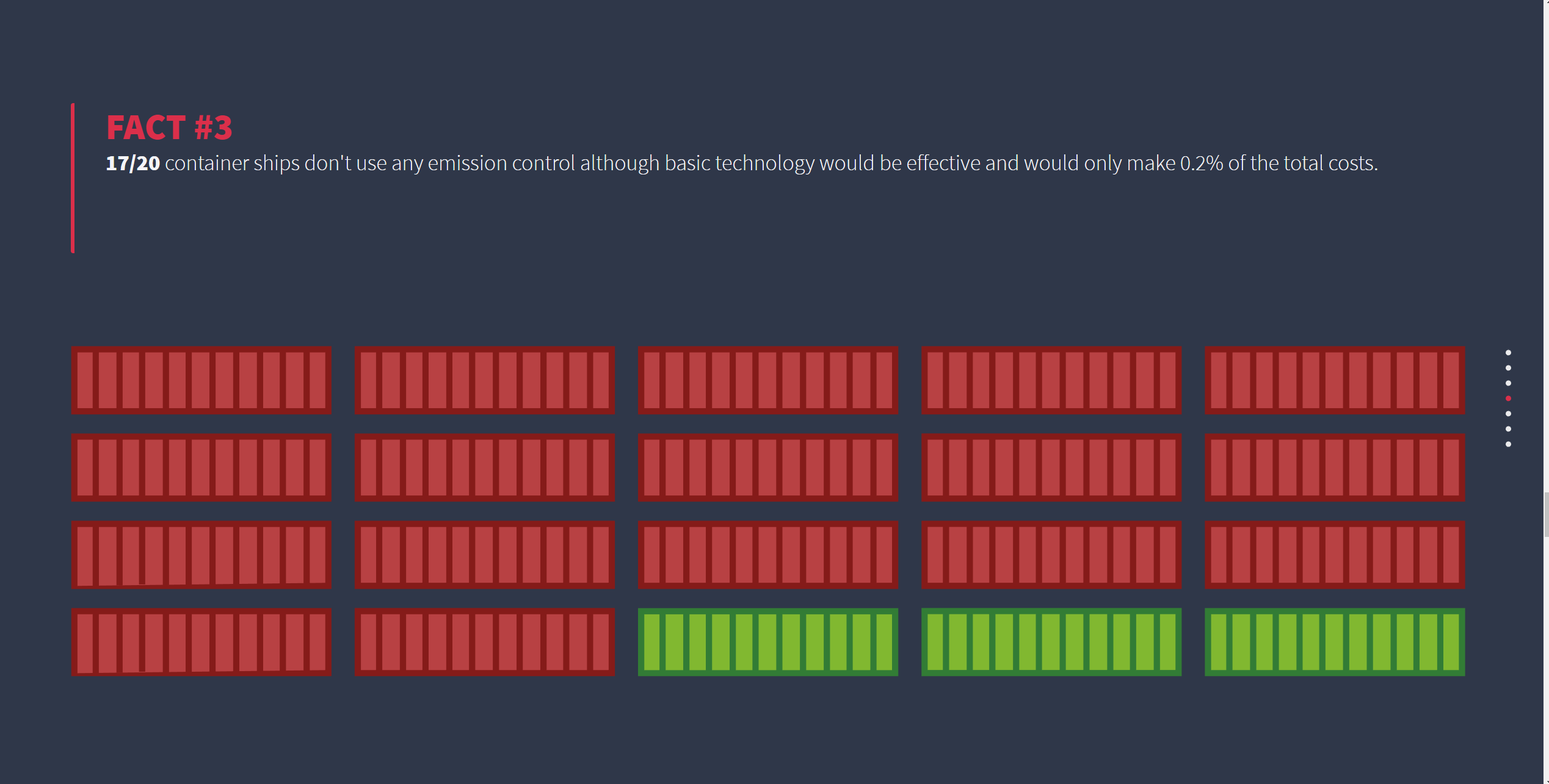The idea we finally realized was a storytelling interface where we could visualize our research. We wanted to show the audience how bad pollution of container ships is compared to daily used things like cars. For that we created a website where we can illustrate facts. In summary we seperated our story in five facts. With every fact we tell something about container ship pollution or compare things against eachother. A visitor can read our story by scrolling through those facts.